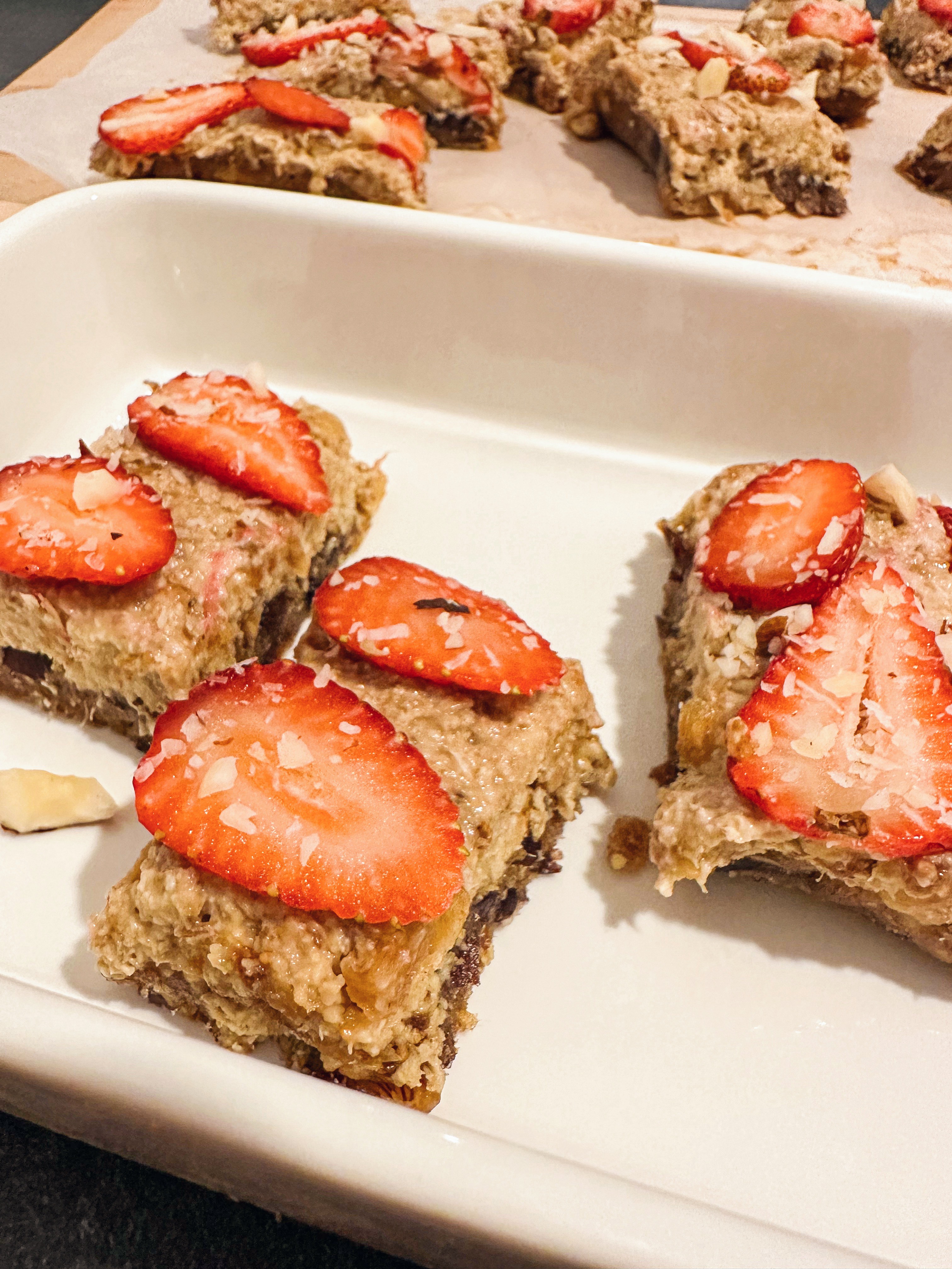 Ingrediente: făină de ovăz, nucă, făină de migdale, curmale, banane, smochine, vanilie, nuci braziliene, căpșuni, sare de himalaya.