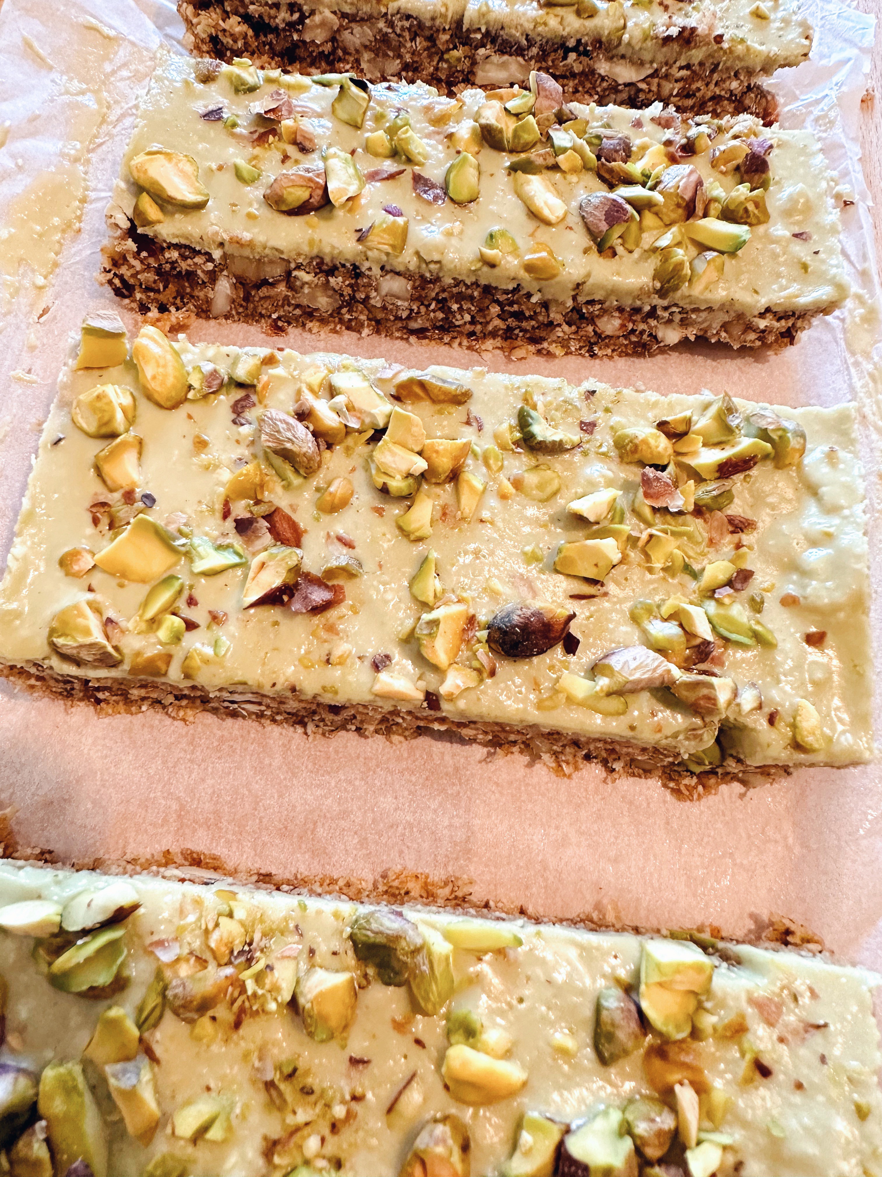 Ingrediente: făină de ovăz, nucă, făină de migdale, curmale, fulgi de cocos, vanilie, unt de arahide, ciocolată fără zahăr cu matcha și cocos (conține lapte), ulei de cocos, fistic, sare de himalaya.